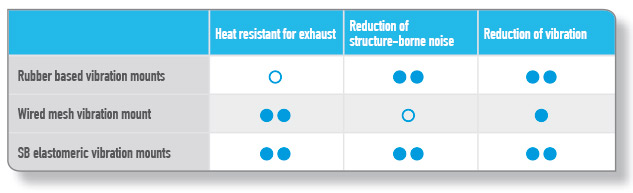 Elastomeric vibration mount with natural rubber are only heat resistant up to 80°C. If the temperature at the surface of the insulation is usually 150°C, the elastomeric rubber vibration mounts with a limit of 80°C would melt. Some other suppliers use ceramic insulation washers. But this does not really help. In difficult installation places, the natural rubber vibration fix points melt.